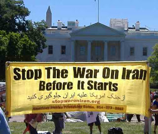 | Cartaz com a inscrição: Pare a guerra ao Irã antes dela começar. |