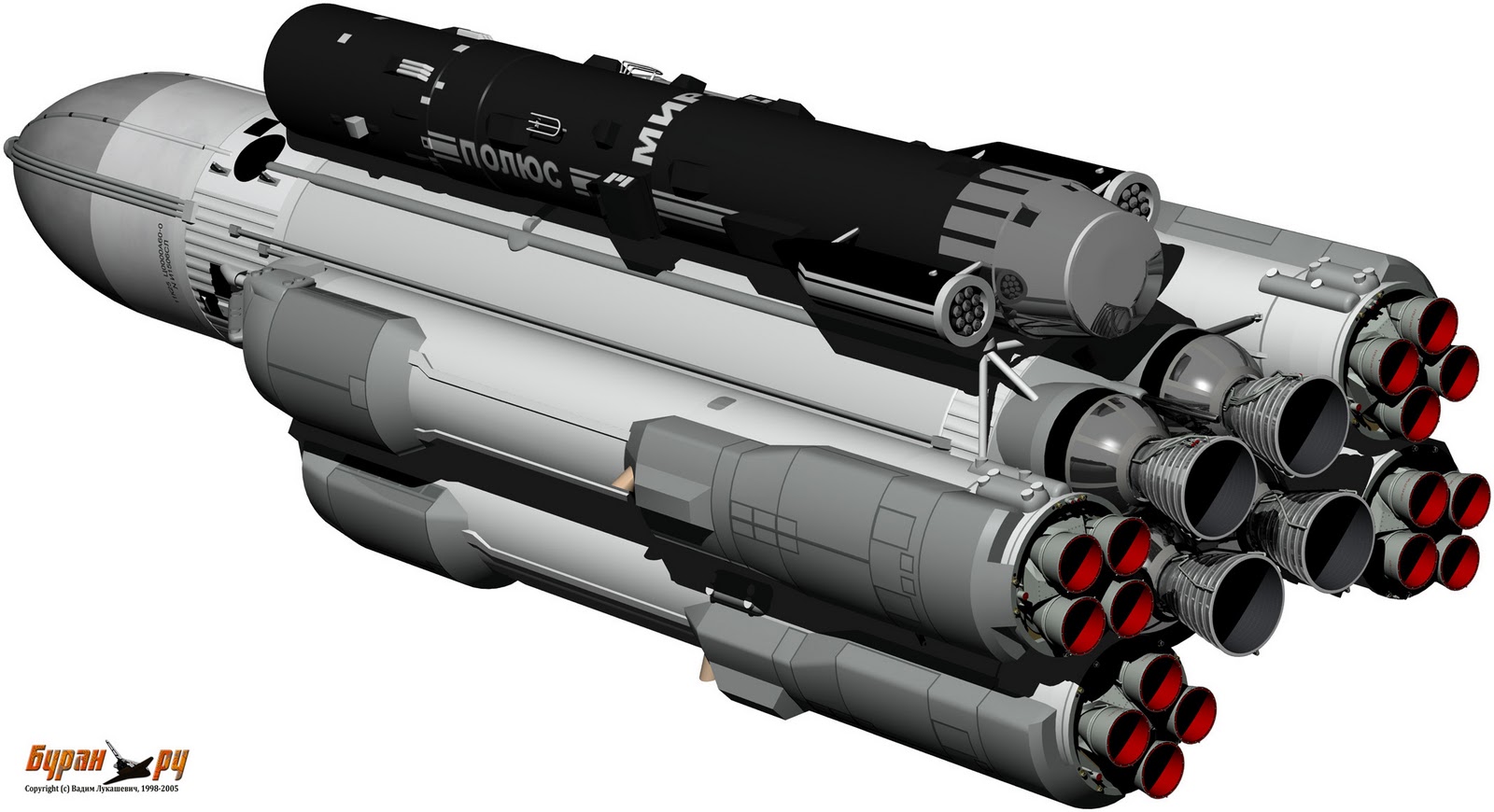 | Ilustração da estação orbital Polyus acoplada aos foguetes de lançamento. |
