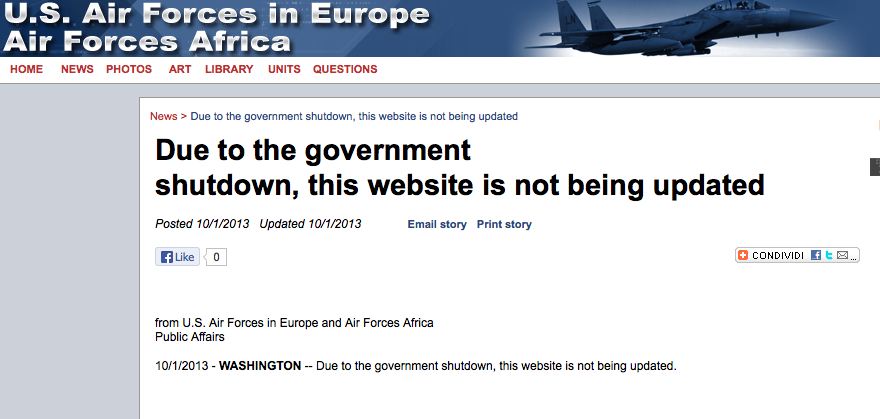 Temos também um exemplo de que o website de uma base da Força Aérea americana informou sua paralisação nas atualizações da página, a Base Aérea de Langley, lar dos F-22, outros sites de bases e comandos da Força Aérea americana também estão com websites paralisados, exceto o www.af.mil que no momento ainda está sem paralisação, a notícia informada pelo site italiano The Aviationist (link para a notícia).