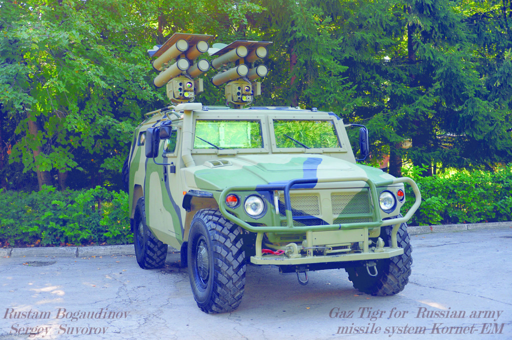 Kornet D: O gaz Tigr pode ser equipado com duas torretas giro estabilizadas armadas com misseis do sistema antitanque Kornet 9M133-1 ( ogiva HEAT – High Explosive Anti Tank, Alto Explosivo Anti Tanque) com 8 km de alcance ou 9M133F-1 (com ogiva termobárica) com 10 km de alcance.