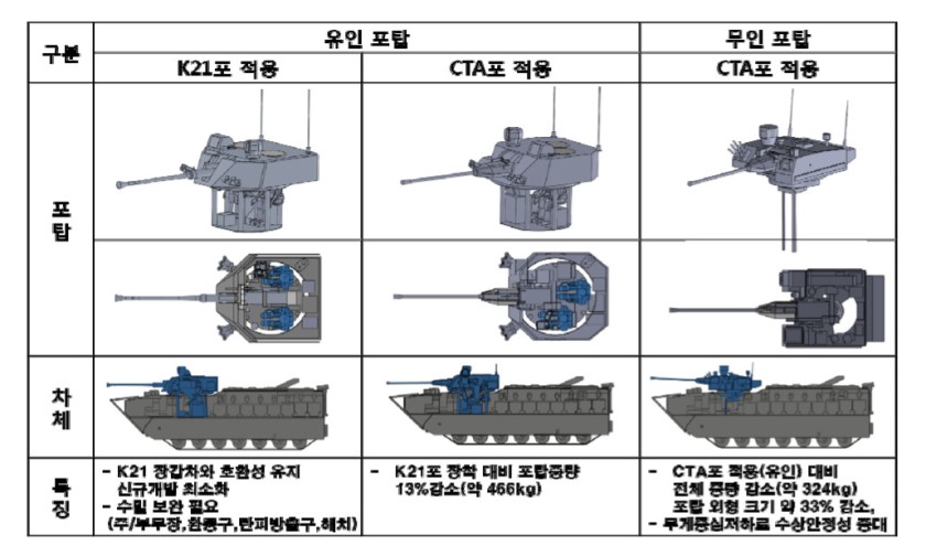A primeira variantes tem um casco de 9m de comprimento, 3,6m de largura e 3,1 m de altura, e sua torre K21 de 40mm localizada atrás do casco teria 2,2m de comprimento, 1,6m de largura e 0,6m de altura. levaria 3 tripulações e 20 soldados equipados. O motor é projetado para 1500 HP de potencia e seria instalado na frente do veiculo, com hidrojatos nas laterais do casco.