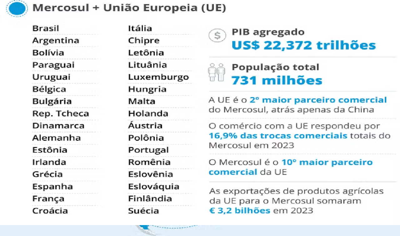 Do ponto de vista econômico, o acordo entre Mercosul e União Europeia representa um marco para dois dos maiores blocos econômicos globais. Juntos, Mercosul (Brasil, Argentina, Paraguai e Uruguai) e União Europeia somam cerca de 780 milhões de pessoas e respondem por mais de 20% do PIB mundial.