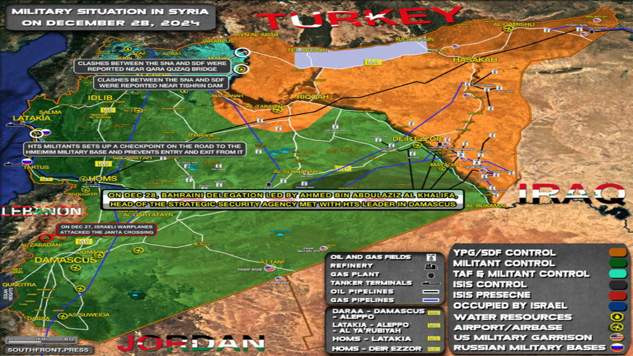 - Militantes pró-turcos estão atacando Manbij para desalojar os curdos , buscando expulsa-los também de Kobani e Raqqa. Os curdos da facção YPG (“Forças Democráticas Sírias “) estão resistindo e os militantes turcos ainda não lograram êxito em expulsar os curdos da região. A questão chave para o futuro da Síria é se o HTS e a Turquia se limitarão a controlar a Síria na margem esquerda ao longo do Rio Eufrates (incluindo a próxima captura de Tabqa e Raqqa) ou se haverá uma invasão da região autonoma curda de Rojava. Os Estados Unidos e a Turquia estão atualmente a negociar esta questão, embora a Turquia esteja mobilizando forças militares e facções abrigadas no intitulado “Exército Nacional Sírio” por ela armado e mantido. Todos os grupos na Síria compreendem perfeitamente que sem o petróleo de Rojava, a situação económica na nova Síria liderada pelos “jihadistas progressistas” será tão inaceitável ou ainda pior de como era durante o governo Assad. Os Estados Unidos, naturalmente, não querem desistir do cartão curdo, que utiliza para encobrir a extração do petróleo sírio e manter a sua presença militar na Síria.