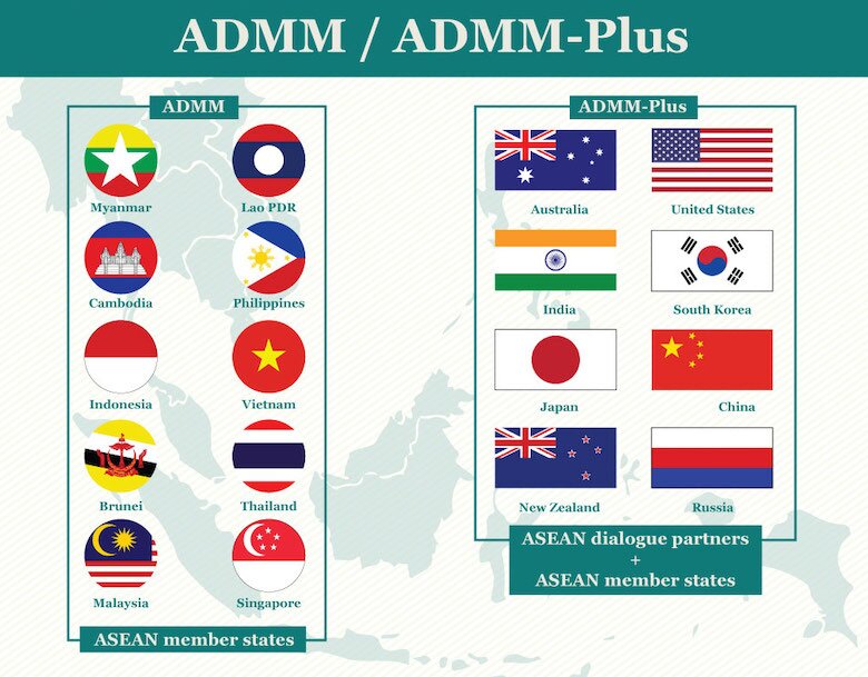 | ASEAN Defence Ministers’ Meeting (ADMM) | Fortalecer cooperação militar e de defesa | Membros da ASEAN, EUA, China, Japão, Índia, Rússia |
