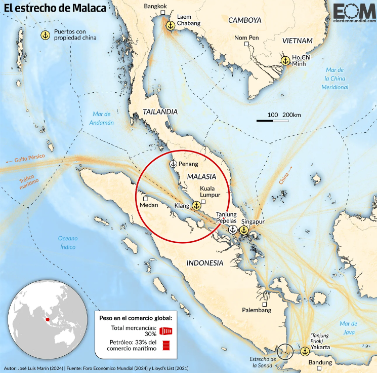 O Estreito de Malaca é uma via marítima crucial para o comércio global, conectando o Oceano Índico ao Mar da China Meridional, entre a Península Malaia e a ilha de Sumatra, na Indonésia. Sua localização estratégica torna-o vital para o transporte de mercadorias entre a Ásia e outros continentes, sendo uma das rotas mais movimentadas do mundo. Aproximadamente 80 mil a 100 mil embarcações transitam por ele anualmente, representando cerca de 25% a 30% do comércio marítimo mundial, o que inclui produtos como petróleo, carvão e bens manufaturados.