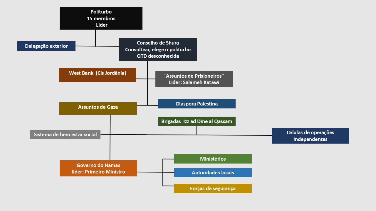A estrutura política do Hamas é bastante organizada e envolve setores com ações sociais, política, econômicas e militares.