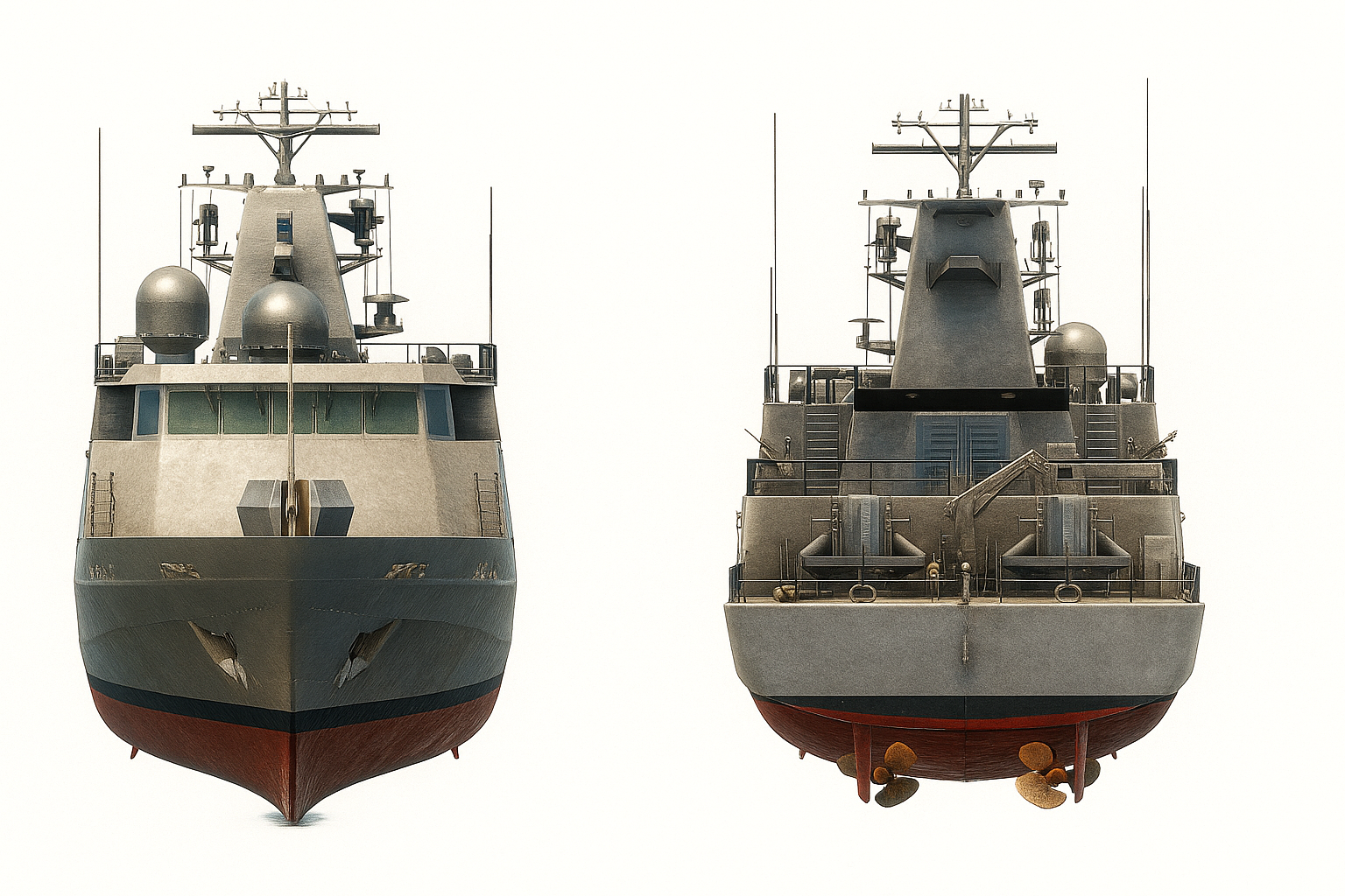 O navio terá casco em aço e superestrutura em alumínio, medindo 57,2 m de comprimento, 8,76 m de boca e 2,58 m de calado, com deslocamento de 592 ton e capacidade para 43 tripulantes. Seu design privilegia eficiência hidrodinâmica, baixo consumo energético e alta manobrabilidade, permitindo operar tanto em áreas costeiras quanto oceânicas.