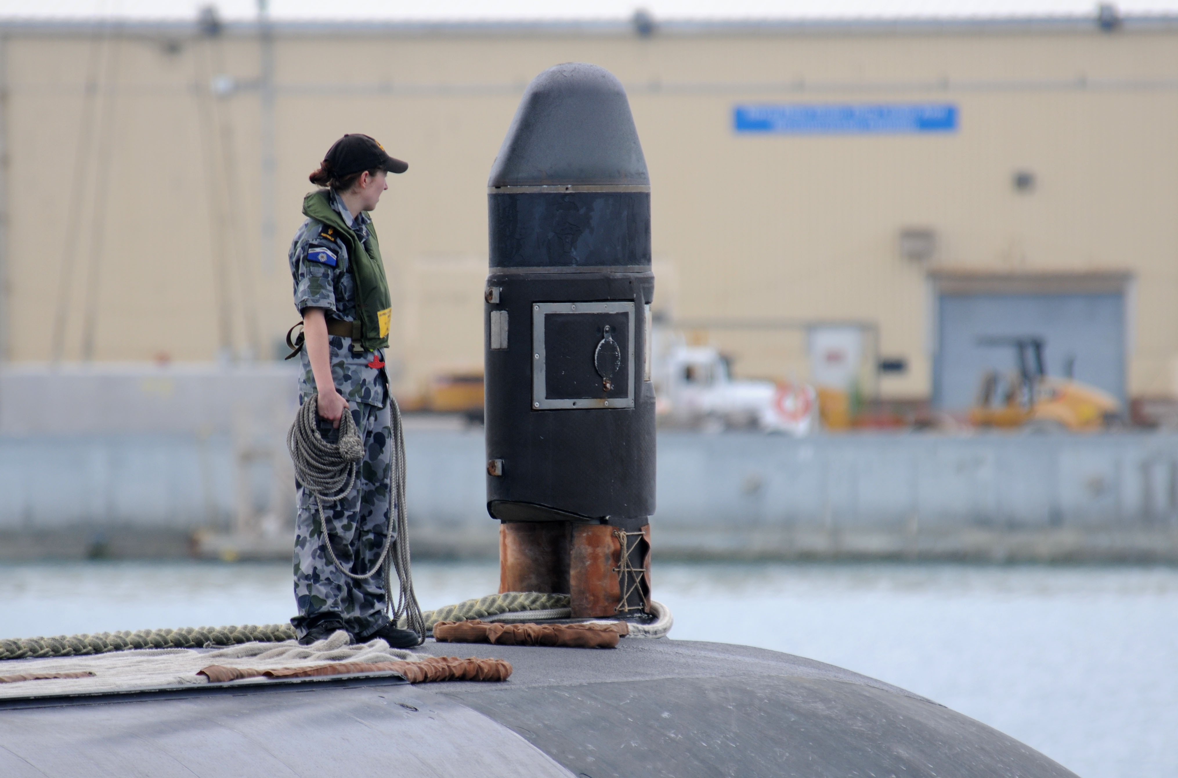 An Australian navy submariner aboard HMAS Waller (SSG 75) prepares to throw a receiving line as the submarine pulls into Apra Harbor, Guam, for a port call. This is the first visit to Guam by an Australian navy submarine since 2008. (U.S. Navy photo by Mass Communication Specialist 1st Class Jeffrey Jay Price/Released)